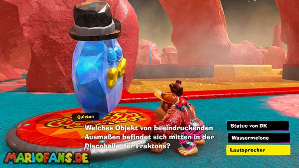 Hier kommst du während der Hauptstory vorbei. Bei dem einem Burger Button musst du mit dem Zebra nach oben laufen. Zerstöre den Schlonz, ein Eingang hat einen Pfeil nach unten. Klettere hier nach oben aufs Dach und hol dir die Banane.