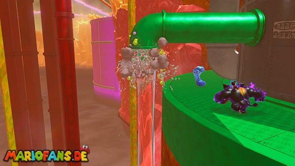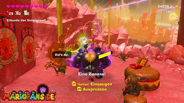 Du musst dich in den Loren-Schlonz-Kampf wagen. Weiche Angriffen aus und nutze Plattformen, um die Banane zu erreichen.