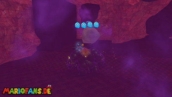 Bezwinge den Leulore, indem du Angriffen ausweichst und Plattformen nutzt. Nach dem Sieg erscheint die Banane.