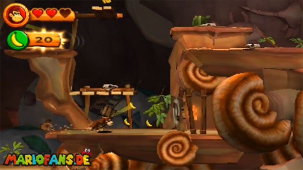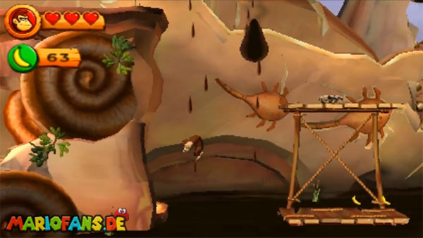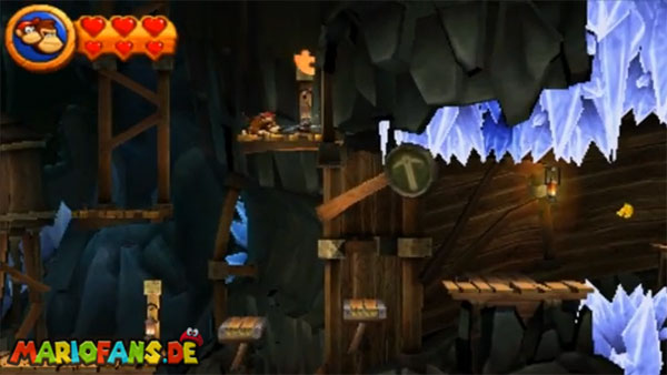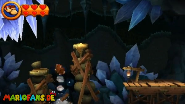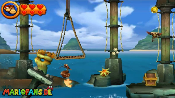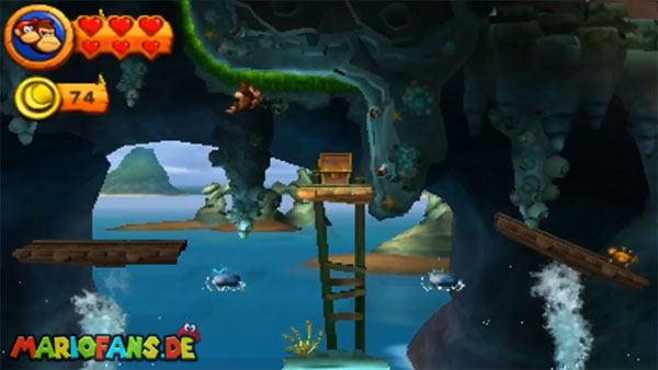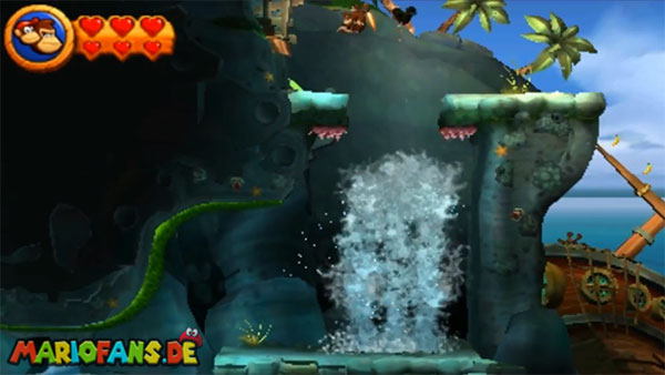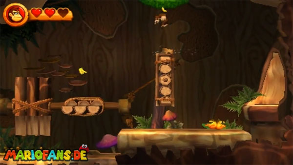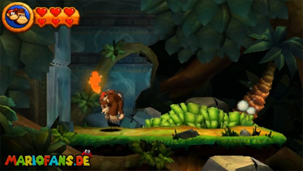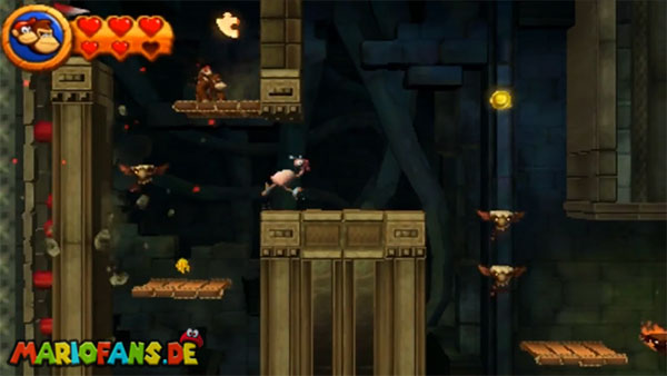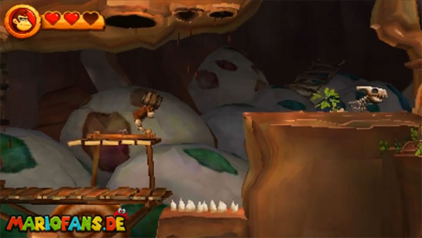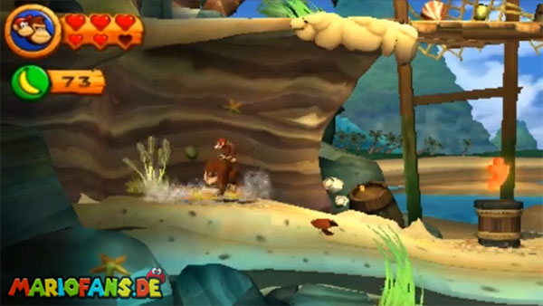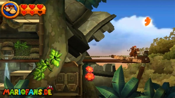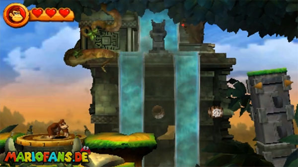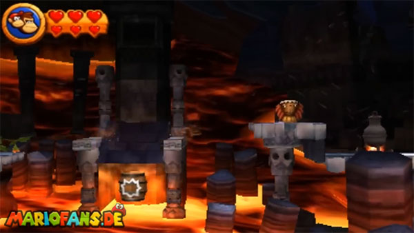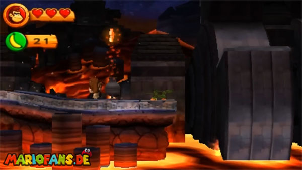 Beim Riesen-Tiki kannst du eine unscheinbare Plattform erreichen. Darunter befindet sich ein Fass für ein Bonuslevel.