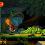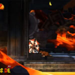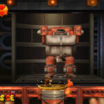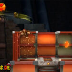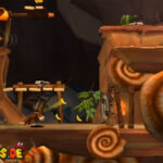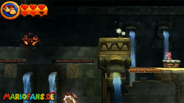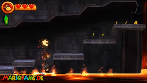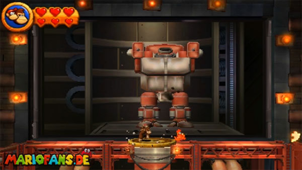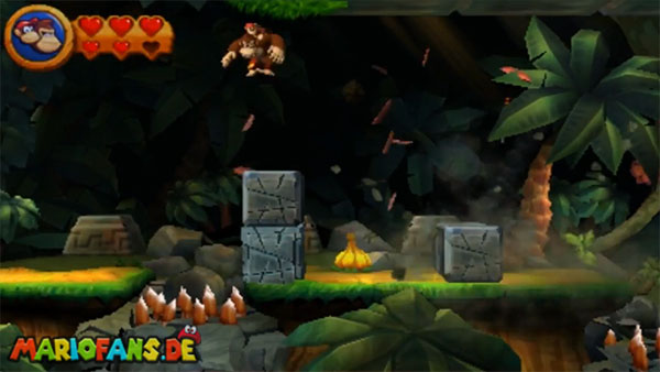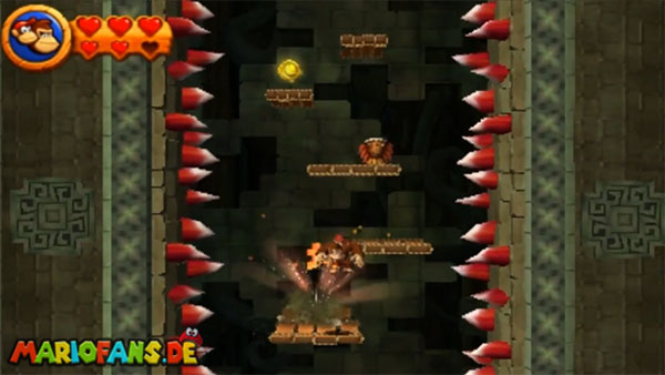In der letzten Phase greift Tiki mit Kopfstößen an: Sobald er auf dem Boden kracht, schließen Feuersäulen zur Seite. Springe über sie hinweg und lande möglichst auf dem roten Schalter am Kopf. Lande drei Volltreffer, und der letzte Endgegner ist besiegt.