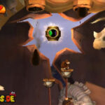 Nach dem zweiten Tutorial-Schwein findest du bei den drehenden Plattform oben links eine verdächtige Stelle. Spring dorthin und hol dir das Puzzleteil. - Puzzleteil 7