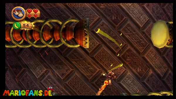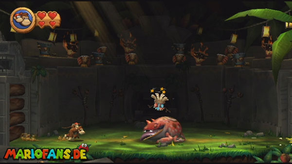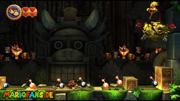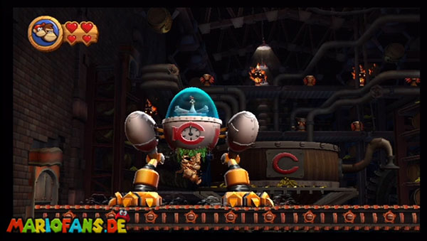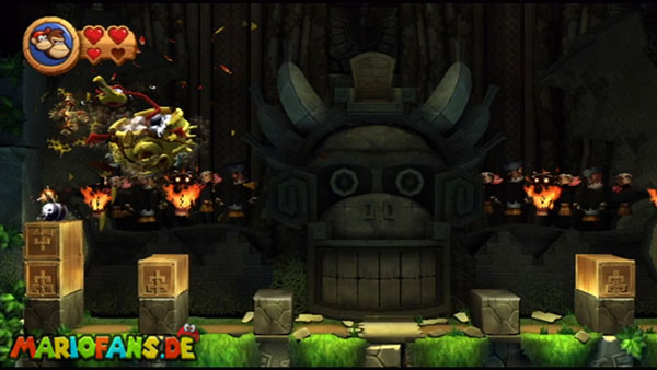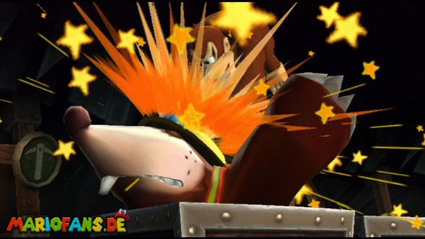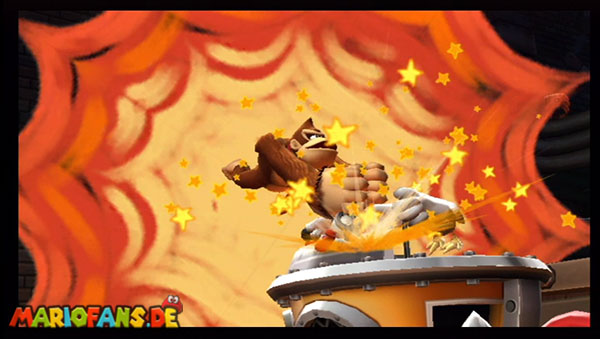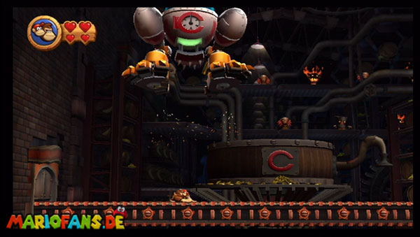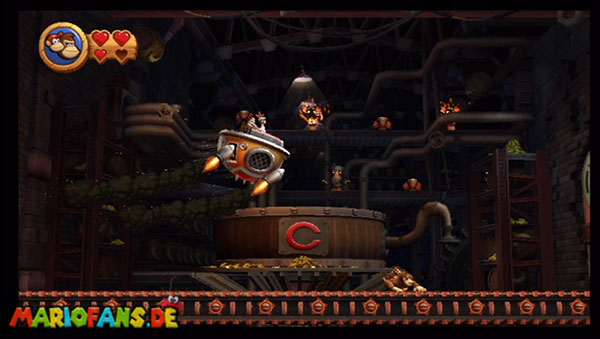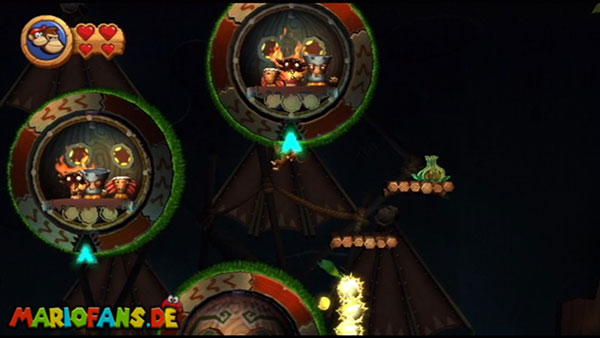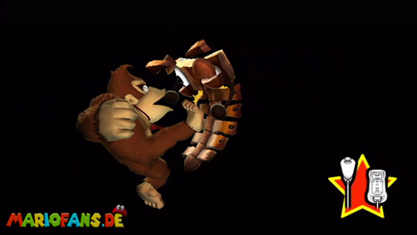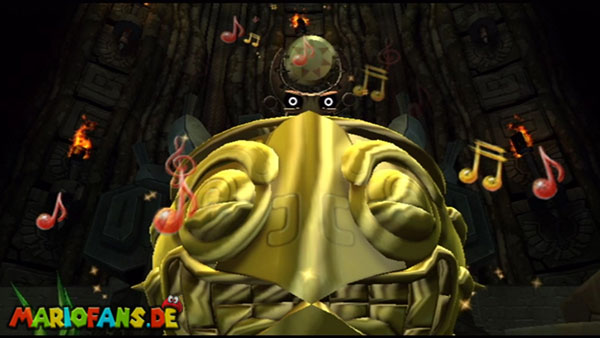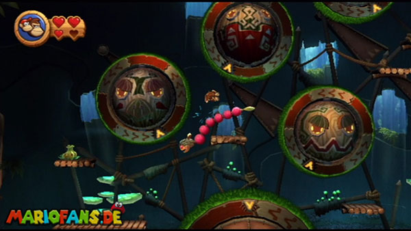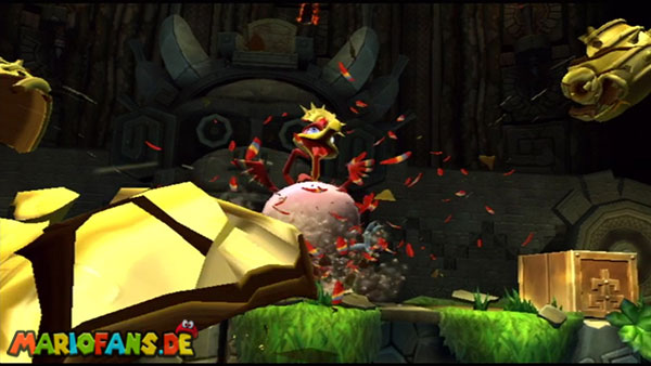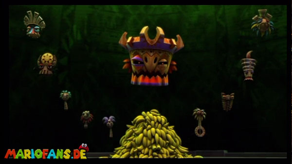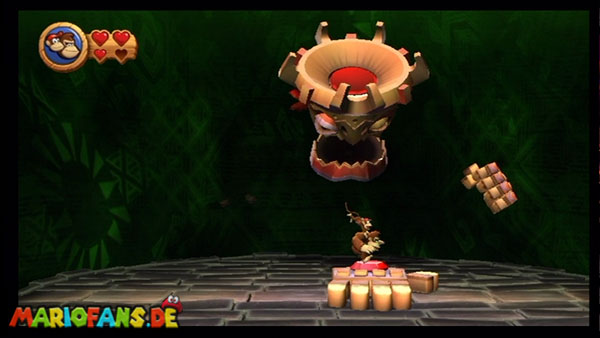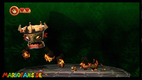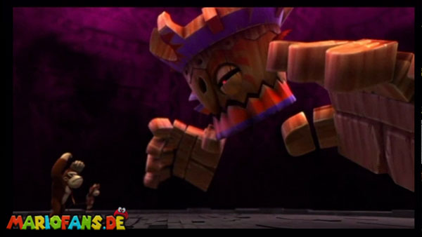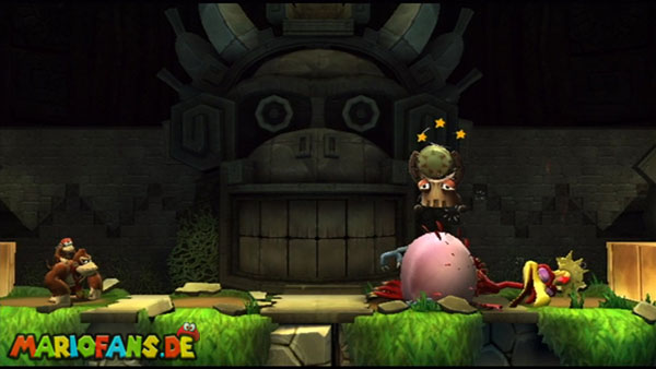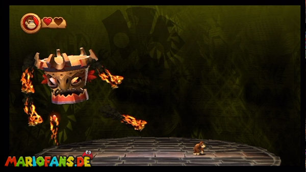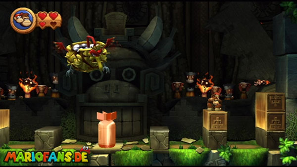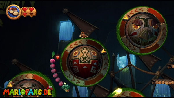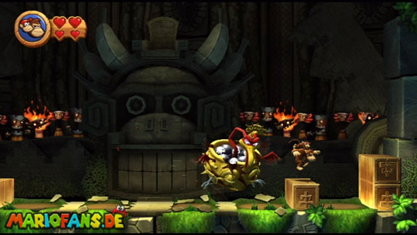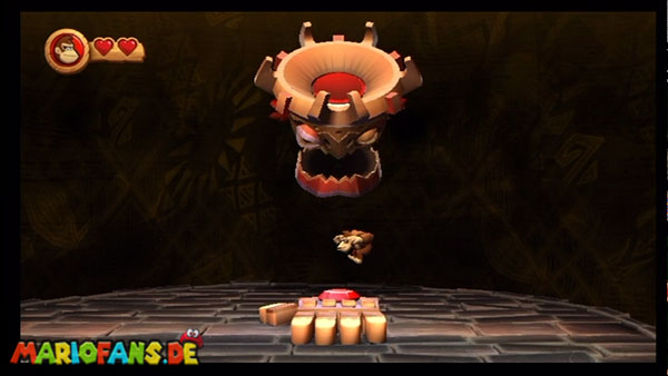 Ihr befindet euch in einem Fass und rast durch die Gegend. Dieses Mal könnt ihr könnt ihr jedoch nicht nur die Flughöhe sondern auch die Geschwindigkeit regulieren. Achtet im oberen Bereich vor allem darauf, nicht mit den Luftballons zu kollidieren. Der Tiki-Gegner ist nun kniffliger. Bewegen sich seine offenen Hände horizontal aufeinander zu setzt ihr zu einem beherzten Sprung an. Klatscht seine Hand vertikal auf den Boden solltet ihr vor dem Aufschlag auf den roten Schalter auf der Oberseite der Hand springen. Nach drei Treffern kommt ihr in die finale Phase.