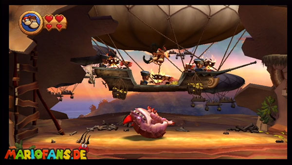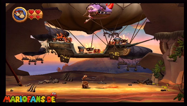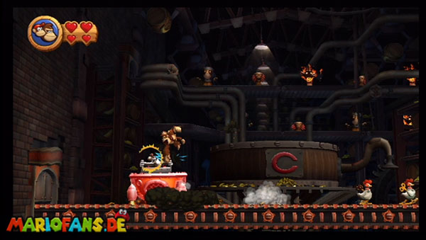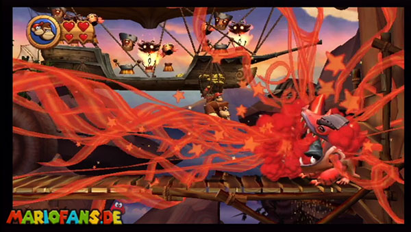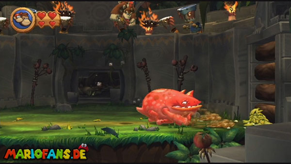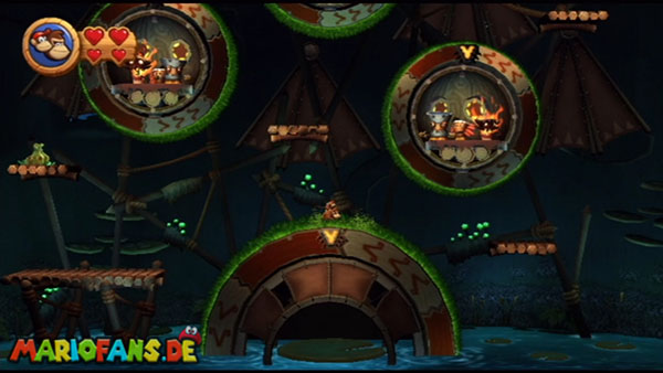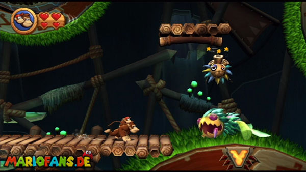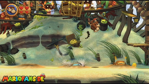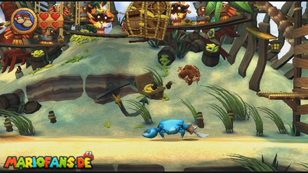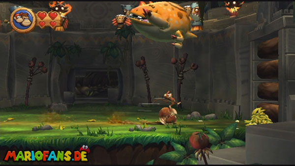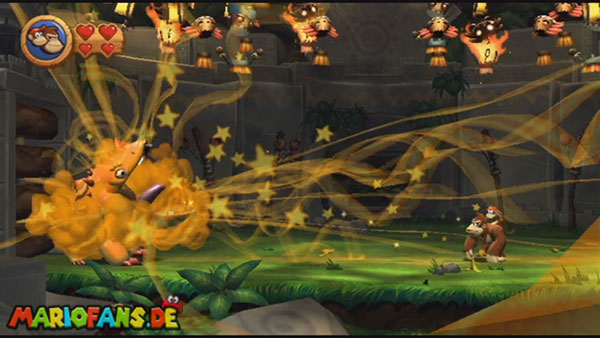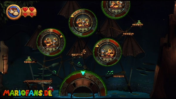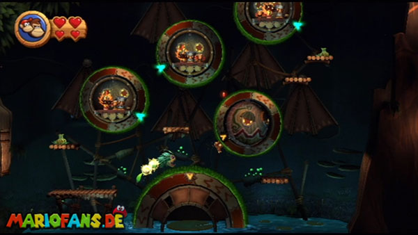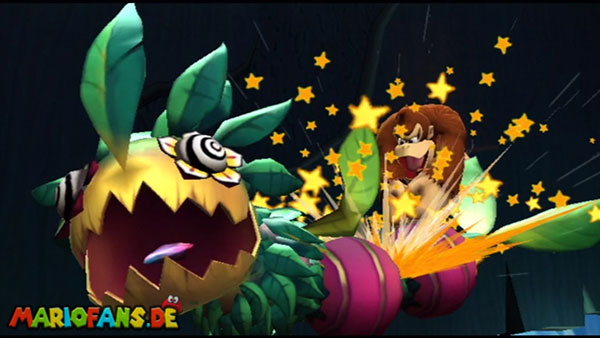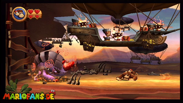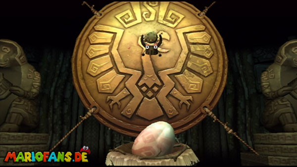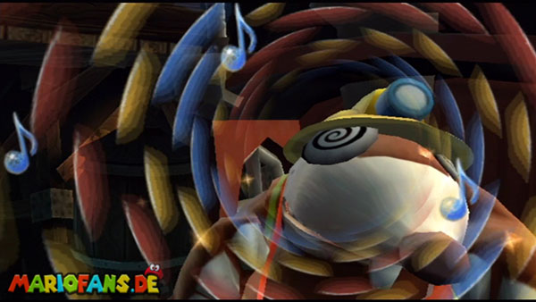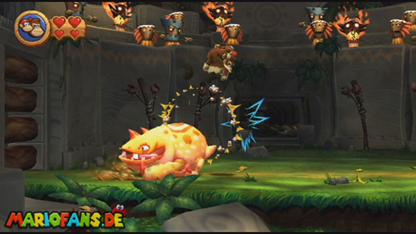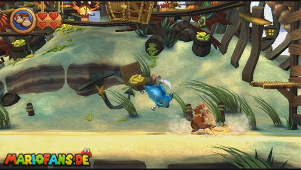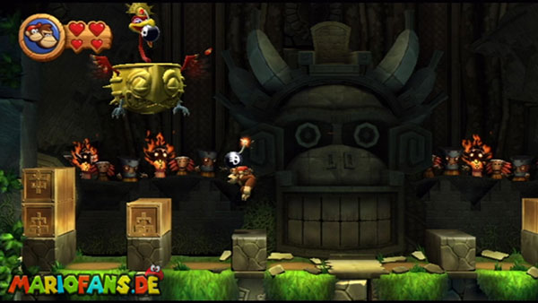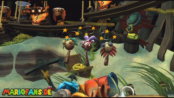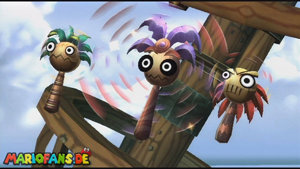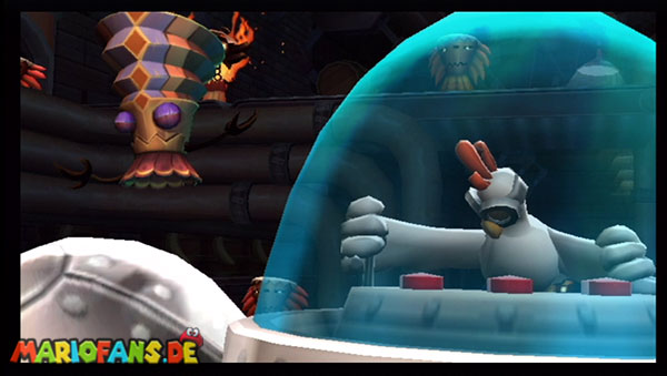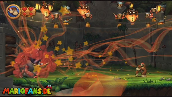 Ihr befindet euch in einem Fass und rast durch die Gegend. Dieses Mal könnt ihr könnt ihr jedoch nicht nur die Flughöhe sondern auch die Geschwindigkeit regulieren. Achtet im oberen Bereich vor allem darauf, nicht mit den Luftballons zu kollidieren. Der Tiki-Gegner ist nun kniffliger. Bewegen sich seine offenen Hände horizontal aufeinander zu setzt ihr zu einem beherzten Sprung an. Klatscht seine Hand vertikal auf den Boden solltet ihr vor dem Aufschlag auf den roten Schalter auf der Oberseite der Hand springen. Nach drei Treffern kommt ihr in die finale Phase.
