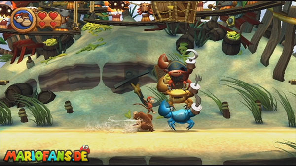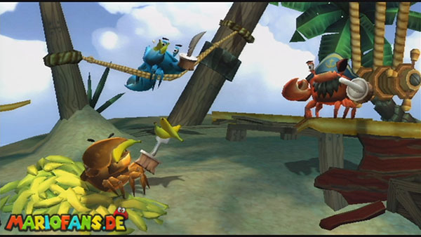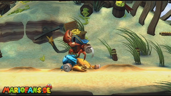 Ihr trefft in diesem Kampf auf drei Krabben. Durch einen Sprung auf den Kopf macht diese bewusstlos, ein weiterer neutralisiert sie. In der zweiten Phase türmen sich die drei übereinander. Wartet, bis sie ihre Scheren in die Luft heben und nutzt dann die Schüttel-Attacke. Springt danach auf alle drei Köpfe und die Phase ist vorbei. Nun müsst ihr ihnen nur noch auf den Kopf springen und anschließend sofort auf den Boden trommeln. Die am Boden liegenden Krabben könnt ihr mit einem letzten Sprung ausschalten. Türmen sie sich übereinander geht ihr wie in Phase 2 vor.