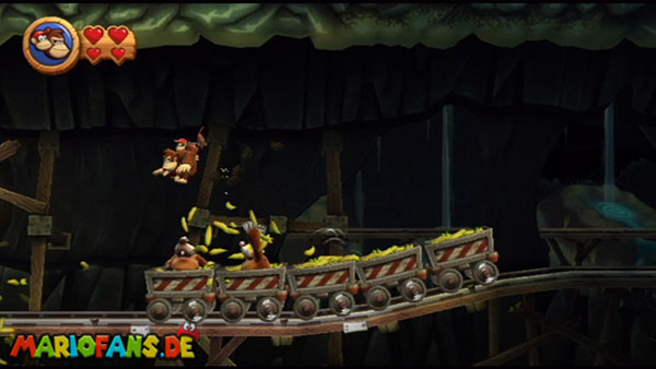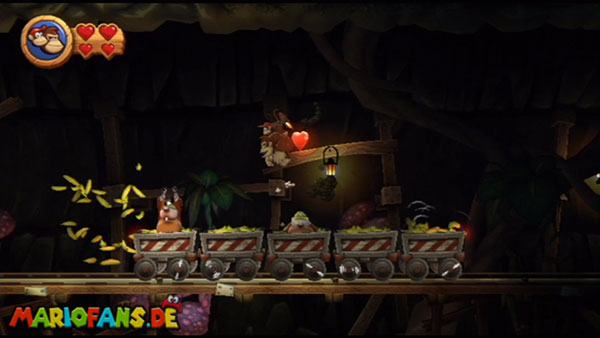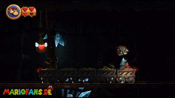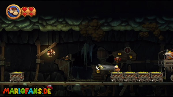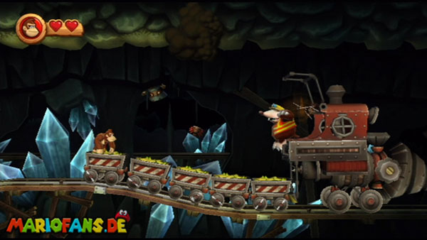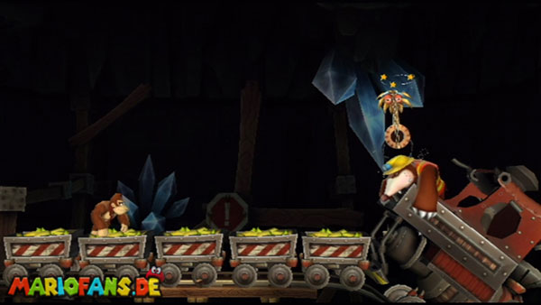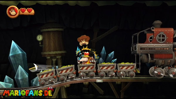 Hier heißt es Ruhe bewahren. Wartet, bis die Werkzeuge auf euch zufliegen und springt im richtigen Moment hoch. Konzentriert euch dann auf die Maulwürfe und sammelt die Extraleben in der Luft auf. Bleibt auf den nicht blau markiertem Zug. In der zweiten Phase kommen die Werkzeuge schneller und öfter angeflogen. Danach springt ihr wieder auf die Maulwürfe und bleibt auf dem richtigen Zugteil stehen. In Phase drei trefft ihr am Anfang auf einen Riesenmaulwurf. Haltet euch vor den wackelnden Waggons fern und hüpft ihm eiskalt auf den Kopf.