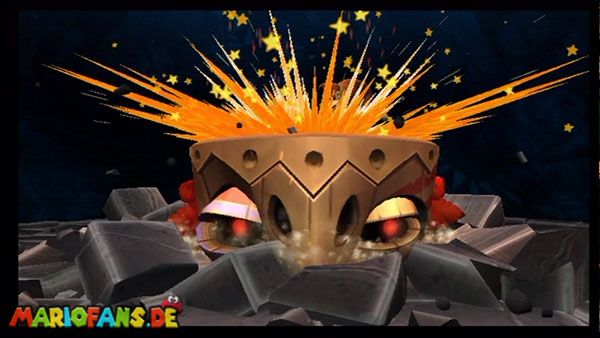 Ihr trefft auf einen eklige, fetten Käfer, der am hinteren Teil seines Rückens seine empfindliche Stelle hat. Springt auf keinen Fall auf den Stachel sondern von hinten drei Mal auf die empfindliche Stelle. Fängt er an, wild durch die Gegend zu hüpfen weicht ihr ihm am besten aus. In Phase 2 hüpft er wieder herum, jetzt jedoch schneller. Weicht wieder aus und springt auf die hintere Stelle. In der dritten Phase bewegt sich der Käfer extrem schnell von links nach rechts und wieder zurück. Weicht ihm aus in dem ihr unter ihm durchspringt. Nach drei weiteren Treffern segnet er das Zeitliche.