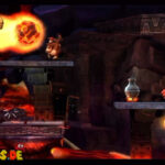 Arbeitet euch nun solange vor, bis ihr zu dem O direkt unter der Plattform mit dem Kessel gelangt. Lasst es vorerst außer Acht und hüpft stattdessen oben links auf die Plattform rüber. Hier müsst ihr euch nun Stück für Stück nach links vorarbeiten und euch dabei unter den entgegenkommenden Feuerbällen hinwegducken, bis ihr auf der Plattform ganz links ankommt.