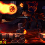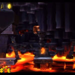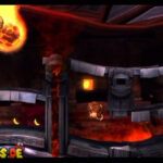 Jetzt wird es knifflig: Krallt euch das Explosiv-Fass beim Checkpoint und bringt es sicher an all den folgenden Lavaströmen und Feuerbällen vorbei, bis ihr schließlich zu der Brücke hinauf hüpfen könnt. Jetzt müsst ihr nur noch unbeschadet an der letzten Kette an Feuerkugeln vorbeikommen, und wenn ihr es dann tatsächlich mit Fass bis ans hintere Ende der Brücke geschafft habt, dann knallt das Ding rechts gegen die brüchige Wand und hüpft in den wohlverdienten Bonusraum rüber.