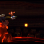 Sobald ihr beim Checkpoint ankommt, lasst unbedingt die Finger vom Explosiv-Fass (da ihr es später noch braucht) und springt gleich auf den ersten Felsvorsprung weiter. Wenn ihr hier einen Moment wartet, sollte sich direkt daneben eine glühende Felssäule aus der Lava erheben, über die ihr in das darüberliegende Fass zum Bonusraum gelangt.