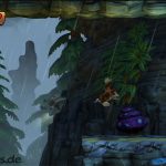 Springt mit Crankys Stock über die Stachelkugeln nach oben und schwingt euch an der Liane zum Portal.