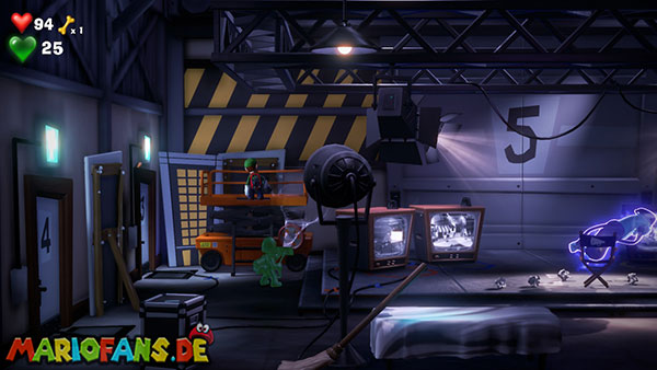 Betätigt mit Luigi und Fluigi die Bodenplatten auf der Tanzfläche und saugt anschließend mit dem Supersauer alles weg. Im so freigelegten Backstageraum verpasst ihr dem Perückenkopf rechts im Regal mit der Düsterlampe einen neuen Schopf und entreißt ihn ihr anschließend sofort wieder für eure Belohnung. - Juwel 4 (grün) – Aufzugsbereich