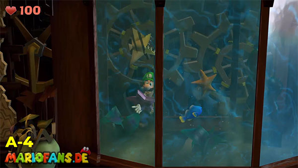 | #1: Am Ende landest du im Geheimlabor. Sauge hier alle Geister ein. Danach saugst du den Helm der Ritterrüstung auf und schießt ihn rechts gegen das Glas für ein Juwel. | #2: Gehe durch die Tür und folge in den Irrgartenkatakomben diesmal nicht den Hundespuren. Untersuchst du die Ritterstatuen, zeigen sie dir mit dem Schwert einen weiteren Weg der ist: Rechts, Oben, Rechts, Unten, Rechts, Oben, Rechts. Hier findest du ein Bild mit einem Spinnennetzball. Befreie diesen und entzünde ihn und geh nun zum großen Spinnennetz. Hinter diesem befindet sich ein Juwel. |