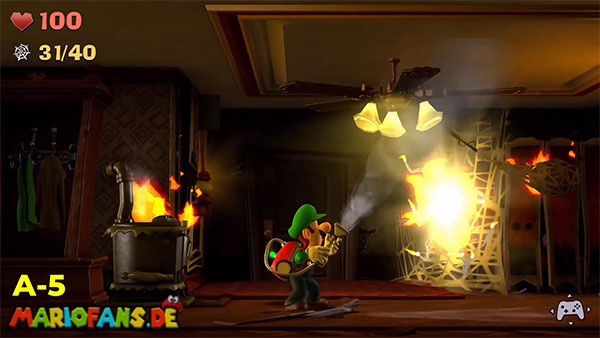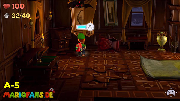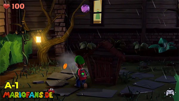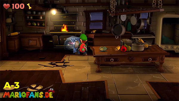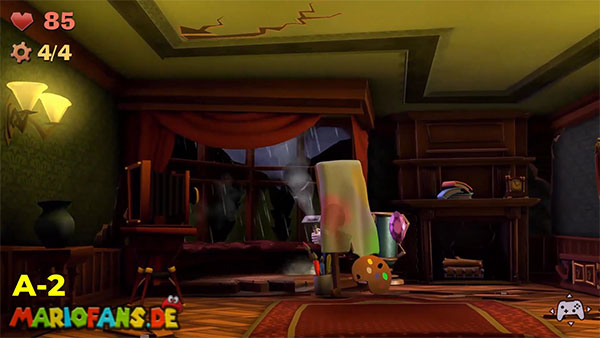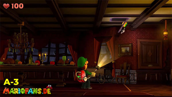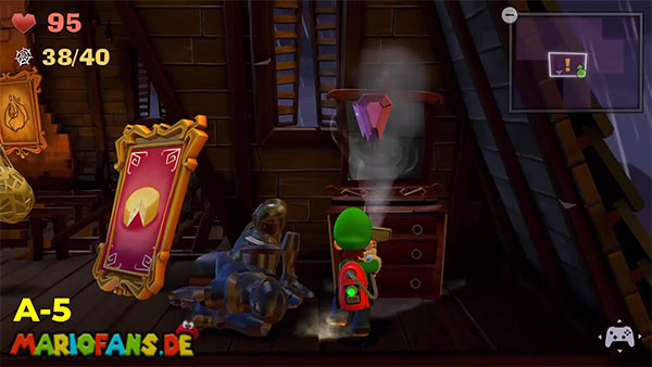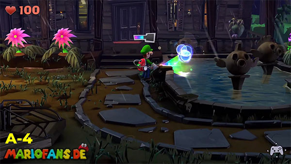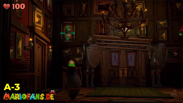 | #1: Am Ende landest du im Geheimlabor. Sauge hier alle Geister ein. Danach saugst du den Helm der Ritterrüstung auf und schießt ihn rechts gegen das Glas für ein Juwel. | #2: Gehe durch die Tür und folge in den Irrgartenkatakomben diesmal nicht den Hundespuren. Untersuchst du die Ritterstatuen, zeigen sie dir mit dem Schwert einen weiteren Weg der ist: Rechts, Oben, Rechts, Unten, Rechts, Oben, Rechts. Hier findest du ein Bild mit einem Spinnennetzball. Befreie diesen und entzünde ihn und geh nun zum großen Spinnennetz. Hinter diesem befindet sich ein Juwel. |