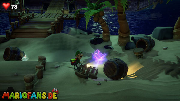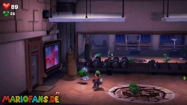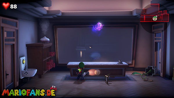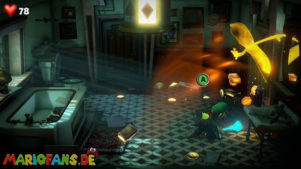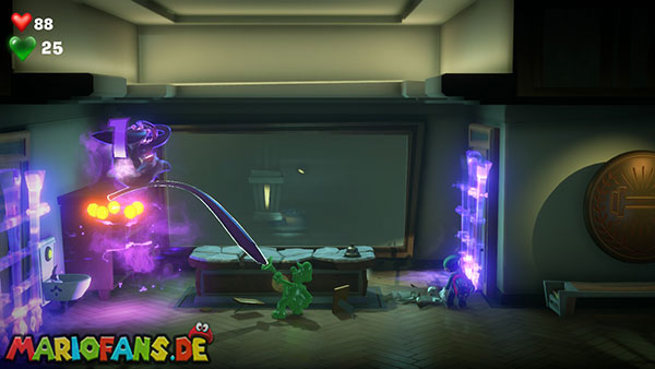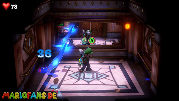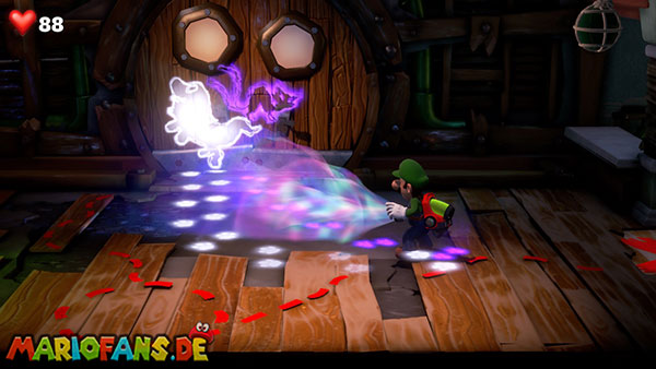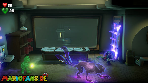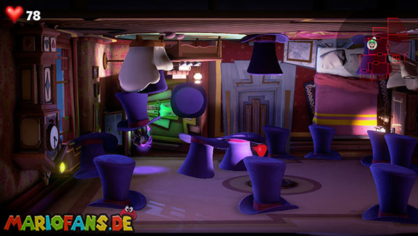 Der große Showdown findet allerdings im Raum mit der Bühne statt (die Lounge). Stellt euch zum Zauberkasten auf die Bühne, holt Luigi hervor und schießt jeweils einen Saugschuss auf eine Hälfte des Zauberkasten. Wenn ihr nun gemeinsam an den Schnurenden zieht, werden beide Teile des Zauberkastens zugleich geöffnet, sodass das Polterkätzchen keine Chance mehr hat, sich irgendwo zu verstecken.
