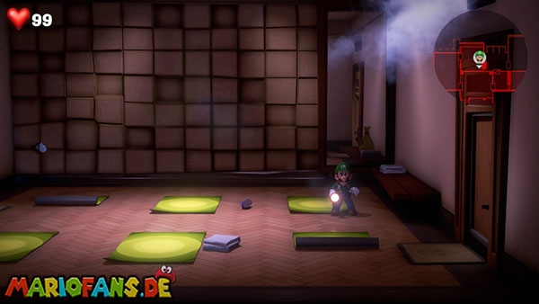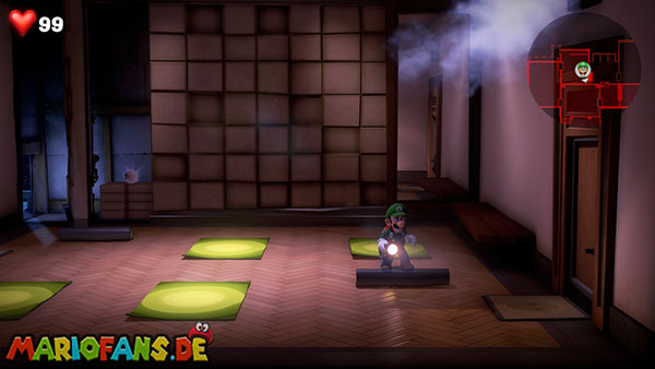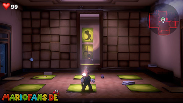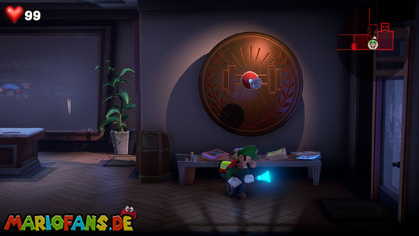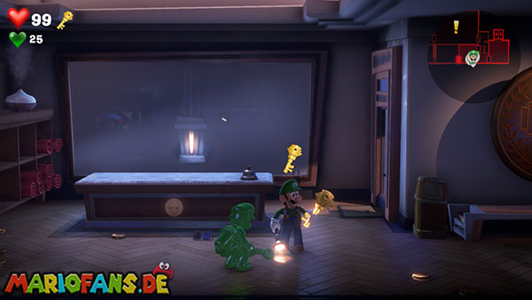 Nabil hinterlässt euch nach dem Kampf den Aufzugknopf für das vierzehnte Stockwerk. Nehmt ihn mit und lauft durch die Tür weiter rechts. Hier könnt ihr eine Menge Geld abstauben, wenn ihr einen unsichtbaren Mülleimer per Düsterlampe sichtbar macht und umwerft. Verlasst den kleinen Flur durch die untere Tür, sodass ihr wieder im Vorraum landet. Aber Vorsicht: Vor der Ausgangstür steht ein Blocker-Geist, den ihr zusammen mit Fluigi aushebeln müsst.