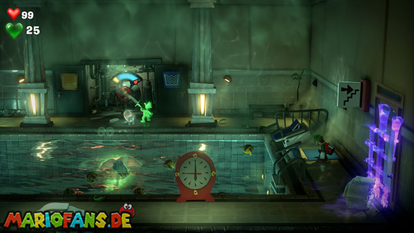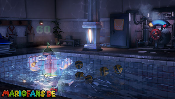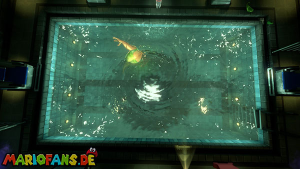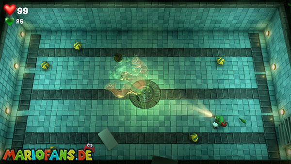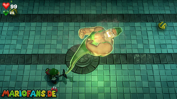 Völlig verdutzt sinkt Nabil Nasshier mit dem Wasser in den Abfluss und bleibt stecken. Nutzt mit Luigi die Leiter auf der rechten Seite, um an den Grund des Beckens hinabzusteigen. Saugt euch nacheinander mehrere Wasserbälle an und haut sie dem Schwimmer-Geist um die Ohren, damit er Sterne sieht. Achtung: Der Strobo-Blitz wirkt bei ihm nicht, weil seine Schwimmbrille den Blitz abfängt.