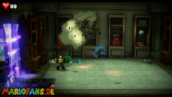 Wenn ihr nun versucht, den Raum über die linke Tür zu verlassen, stellt ihr fest, dass Luigi dafür keinen Schlüssel hat. Fast im selben Moment prallt ein Ball an die beschlagene Scheibe im Hintergrund. Stellt euch an die Scheibe und schaut durch das kleine Stück, das nicht mehr beschlagen ist. Ihr entdeckt den kommenden Boss-Geist Nabil Nasshier. Kurz darauf erscheinen mehrere Geister. Macht sie platt, um den Schlüssel zu erhalten. Schließt damit die linke Tür auf und schreitet in den Umkleideraum.