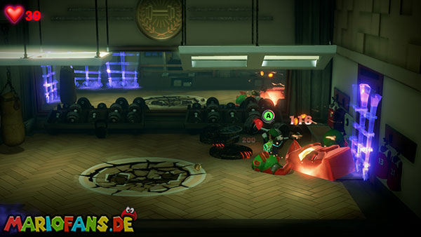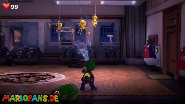 Sollte der Geist mit den Gewichten allein übrigbleiben, dann, dann stürmt er auf Luigi los. Schnappt euch einen der Boxhandschuhe vom besiegten Boxer-Geist und schleudert ihn auf das Gesicht des Wüterichs, damit er wehrlos ist. Den Rest kennt ihr.