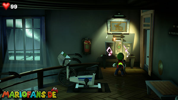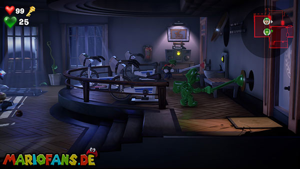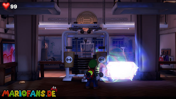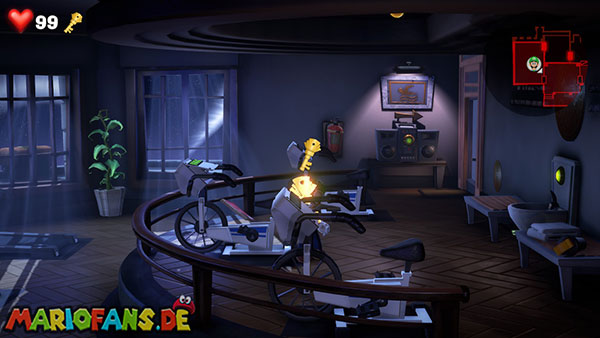 Schreitet durch die linke Tür in den Trainingsraum. Hier stehen viele Cardio-Trainingsgeräte herum. Die Tür hinten rechts ist allerdings verschlossen, ihr kommt also vorerst nicht weiter. Wenn ihr die Trainingsräder durch saugen bewegt oder Luigi auf den Laufbändern rennen lasst, bis alle Lampen auf dem Gerät leuchten, werdet ihr mit Geld belohnt. Im Laufband ganz unten ist zudem der gesuchte Schlüssel versteckt.