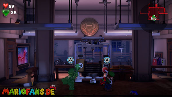 Steigt in den Aufzug und setzt den Aufzugsknopf ein. Nun ja, Luigi versucht es zumindest. Es kommt mal wieder ganz ärgerlich: Leider meldet sich das Polterkätzchen wieder und schnappt Luigi den Aufzugknopf weg. Nehmt sofort die Verfolgung auf! Die Katze bewegt sich zurück in den Fitnessbereich.
