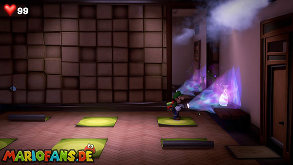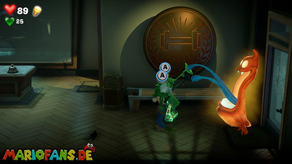Weiter geht es nach links in den Kraftraum. Es wird plötzlich ziemlich knifflig, denn die zwei Wüterich-Geister, die hier trainieren, schützen sich vor eurem Stroboblitz. Damit ihr sie besiegen könnt, müsst ihr sie gegeneinander ausspielen.