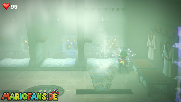 Kehrt in den Yoga-Raum zurück, schließt die Tür auf der rechten Seite auf und schreitet in den Duschraum. Wie unschwer zu erkennen ist, duschen sich hier drei Schlingel. Der Wasserdampf ist allerdings so dicht, dass sie nicht einmal richtig mitbekommen, dass Luigi anwesend ist. Kein Wunder: Die Düsterlampe hat im dichten Dampf keine Wirkung.