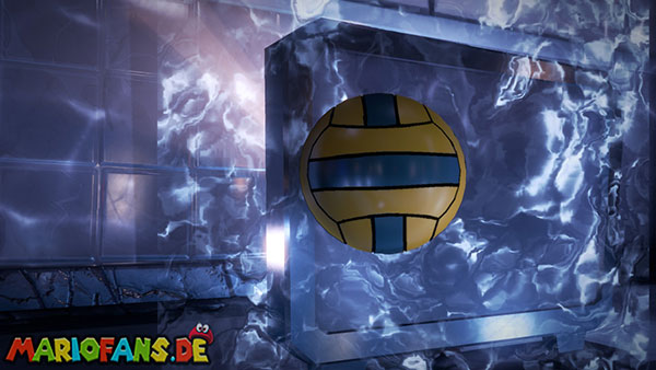 2) Lasst Fluigi nur bis zum nächsten geschützten Ort laufen, also hinter eine der beiden Säulen auf der Hinterseite des Beckens. So ist er gegen Wasserspritzer geschützt. Wenn Fluigi dort sicher steht, muss Luigi dem Schwimmer noch einen weiteren Ball an den Kopf donnern.