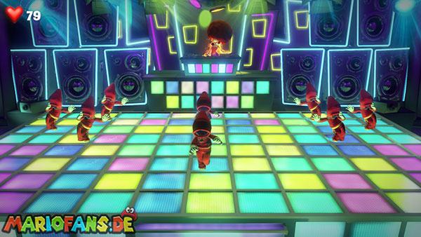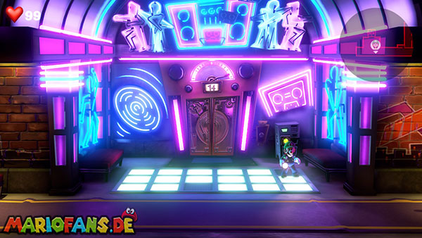 Wenn ihr wollt, könnt ihr an der Wand ganz rechts noch den Verschluss zu einem Rohr per Saugschuss entfernen, um Fluigi durch das Rohr zu schicken, Das bringt euch ein wenig Geld ein. Schreitet anschließend die Treppe hinauf und betretet hinter der Tür die Tanzfläche.