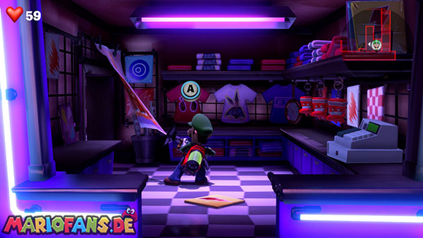 Wenn sie erledigt sind, öffnet ihr die Absperrung der Garderobe mit einem Druckstrampler und lauft hinein. Saugt alles ab und begebt euch weiter hinten über den linken Zugang in den längeren Flur der Garderobe. Saugt dort alle Kleidungsstücke vom linken Haken herunter, damit dieser immer leichter wird. Sind alle Kleidungsstücke weg, öffnet sich eine Schublade auf Bodenhöhe, die Geld und ein Juwel ausspuckt.
