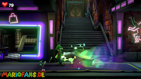 Zurück auf der oberen Ebene lauft ihr einfach nach links in den Flur hinein, bis zum Ende, wo die beiden Plattenspieler an der Wand hängen. Bringt Luigi dazu, die beiden Plattenspieler mit dem Sauger anzutreiben. Das bringt einen Mechanismus dazu, einen Block aus der Wand zu fahren, der den freischwebenden Münzblöcken aus den Super-Mario Hüpfspielen ähnelt. Stellt euch drunter und vollzieht mehrere Druckstrampler, damit Luigi mit dem Kopf dranstößt und ein paar Münzen herausholt. Zum Schluss fällt auch noch ein Juwel aus dem Block.