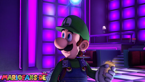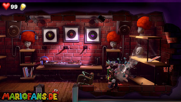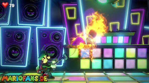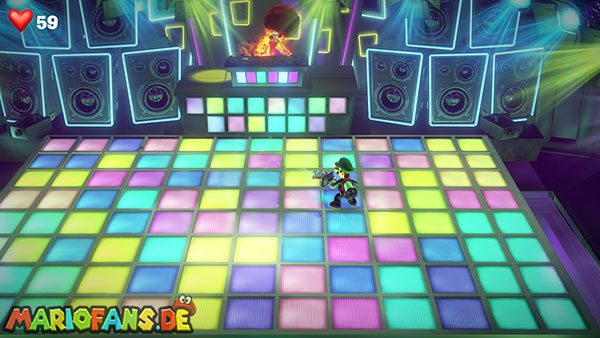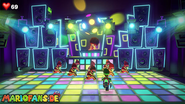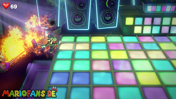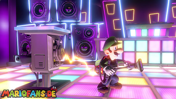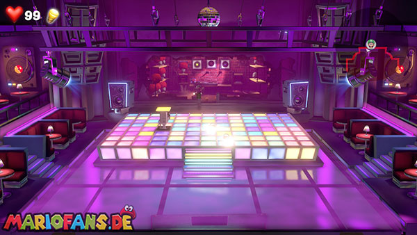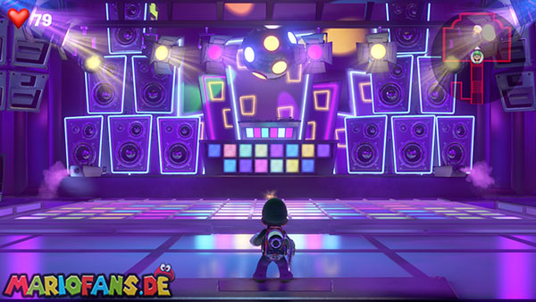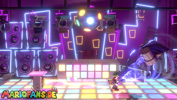 Nun schaut auf die hintere Wand zu den aufgehängten Vinylplatten. Eine von diesen Platten hat in der Mitte einen Strobopunkt. Aktiviert ihn mit dem Stroboblitz. Dadurch fahrt ihr die Treppen der seitlichen Sitzplätze des Ballsaals aus. Dirigiert Luigi auf eine der beiden Seiten an die hintere Wand zu einem Plattenspieler, der an der Wand hängt. Lasst die Platte mithilfe der Saugfunktion laufen. Das Gleiche macht ihr mit Fluigi auf der gegenüberliegenden Seite, sodass beide platten gleichzeitig laufen. Das Sprengt die hängenden Boxen, wodurch die Diskokugel zu Boden fällt und ein Juwel ausspuckt.