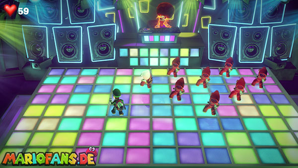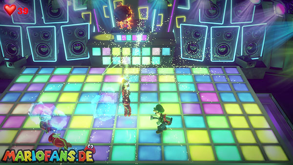 Stellt euch nach dem Kampf auf die einzigen beiden schwarzen Felder der Tanzfläche, um eine Spezial-Steckdose hochzufahren, Mit ihrer Power saugt ihr den kompletten Hintergrund der Disko weg, sodass das DJ-Zimmer offenliegt.