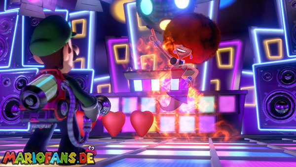Die Geisterdame mit der Afro-Perrücke hat es faustdick hinter den Ohren und ist mit ihren 450 Lebenspunkten auch noch gut gepolstert. In der ersten Kampfphase wirft sie Platten nach Luigi und greift im Wechsel direkt an, indem sie rotierend auf ihn zukommt. Weicht ihr so gut es geht aus. Ihr könnt sie für einen kleinen Moment durch einen Druckstrampler fernhalten, aber das ist ein Tropfen auf dem heißen Stein. Versucht ihr lieber auszuweichen, genug Platz habt ihr ja. Notfalls könnt ihr auch die Tanzfläche an den Rändern verlassen.