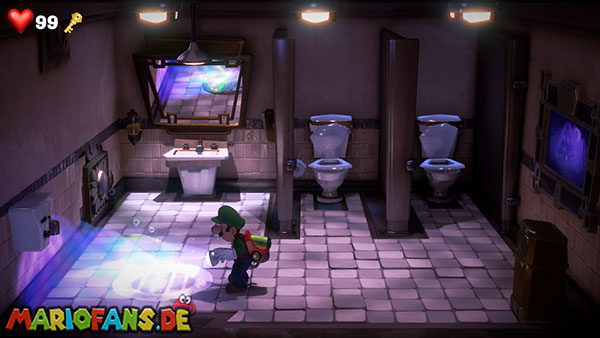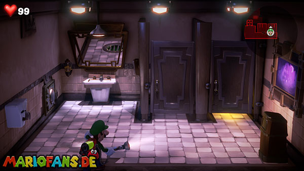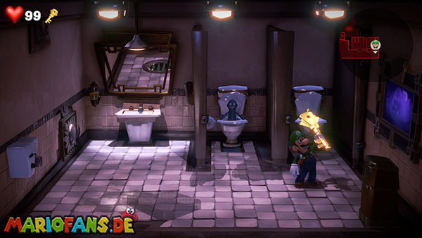 Von den zwei Toiletten könnt ihr nur die rechte betreten. Brecht die rechte Tür auf und sammelt den Schlüssel ein, der in der Kloschüssel liegt. Leuchtet hier mit der Düsterlampe auf den Boden, um ein Abflussgitter zu enthüllen. Lasst euch mit Fluigi nach unten fallen und dreht links am Handrad das Wasser zu. Kehrt zu Luigi zurück und schlüpft dann mit Fluigi durch das linke Rohr, um in die andere Toilette zu gelangen. Auf dem Klodeckel der linken Toilette findet ihr das violette Juwel (1/6).