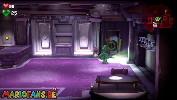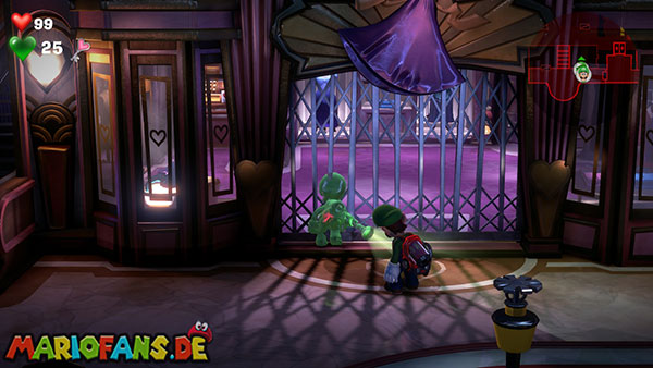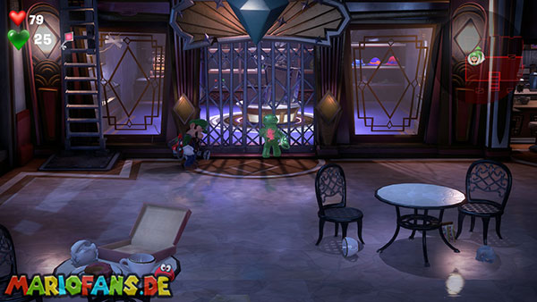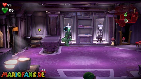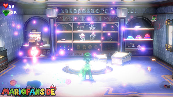 Die Boutique befindet sich unten rechts. Geht mit Fluigi hinein und schießt einen Saugschuss auf die linke Schaufensterpuppe im Raum. Wenn ihr daran zieht, wird ein Mechanismus ausgelöst, der einen Geheimraum öffnet. Über der Truhe findet ihr das rote Juwel (4/6) auf einem Balken. Benutzt nun den Herz-Schlüssel bei der Kasse und blitzt den Sensorschalter dahinter an.