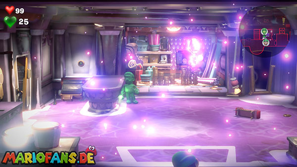Flutscht dann mit Fluigi durch die Gitter des Karo-Ladens und schnappt euch mit einem Saugschuss einen schweren Koffer aus der Mitte. Damit könnt ihr die Vitrinen im Laden zerstören und so das gelbe Juwel (3/6) erhalten. Öffnet danach die Kasse mit dem Karo-Schlüssel. Besiegt anschließend die erscheinenden Geister und schnappt euch den Herz-Schlüssel.
