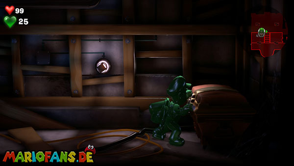 Macht mit der Düsterlampe das Gitter am Boden sichtbar und geht mit Fluigi hindurch. Dreht unten am Rad, wechselt zu Luigi und öffnet das Rohr an der Wand. Rutscht als Fluigi hindurch und holt euch den Juwel.