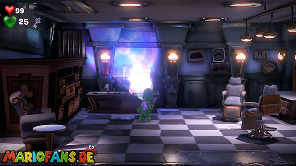 Geht mit Fluigi hinein und dreht die zwei Friseurstühle mit eurem Staubsauger, damit zwei Goldgeister erscheinen. Leuchtet danach den Raum mit der Düsterlampe ab, um u. a. die Kasse zu finden. Öffnet diese und ihr erhaltet den Stern-Schlüssel.