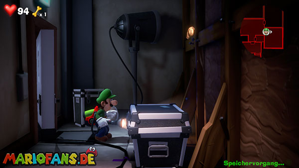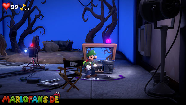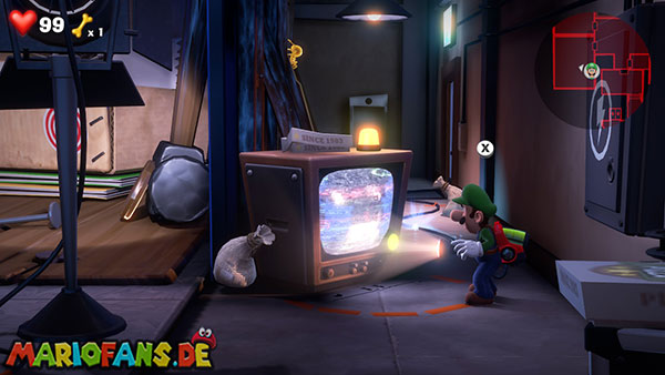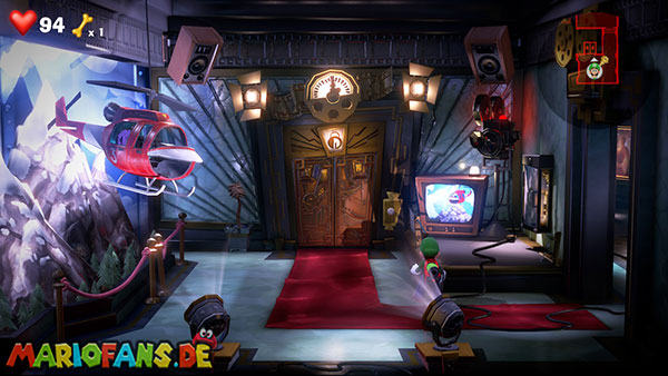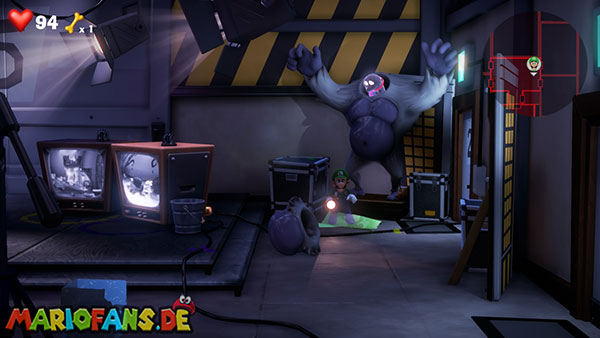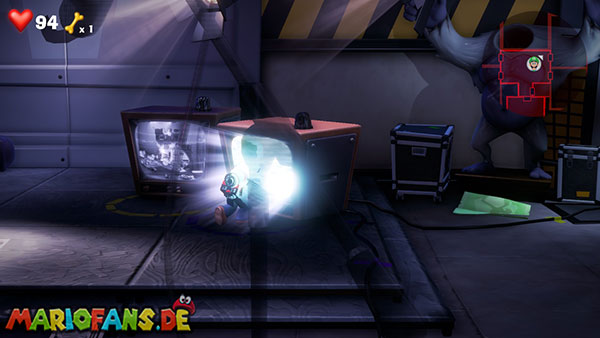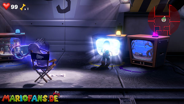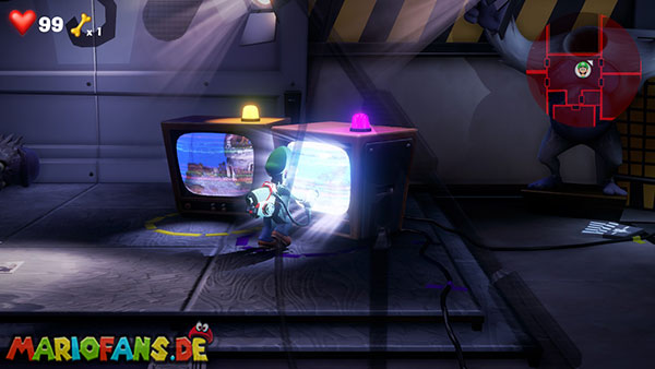 Werft die Fackel runter, verlasst die Kameraperspektive und saugt die Fackel mit Luigi an. Über den Fernseher gelangt ihr mit der Fackel zurück zum Backstage-Bereich. Steigt dann in den zweiten Fernseher (blaue Leuchte), um das Feuer-Set (Saal 3) zu erreichen.