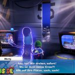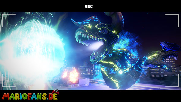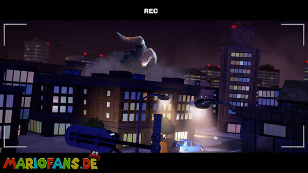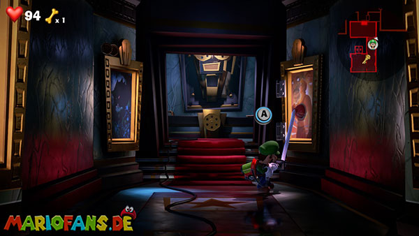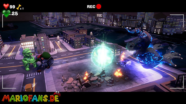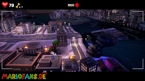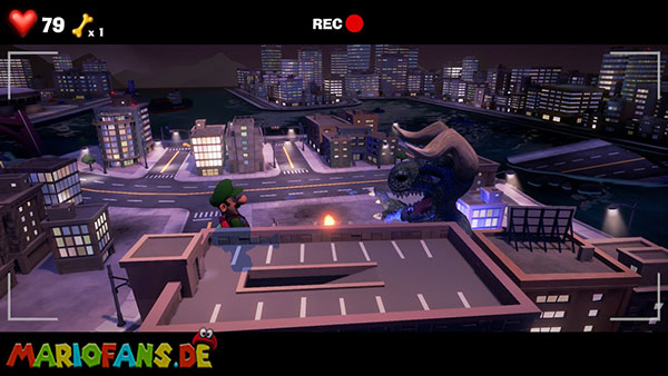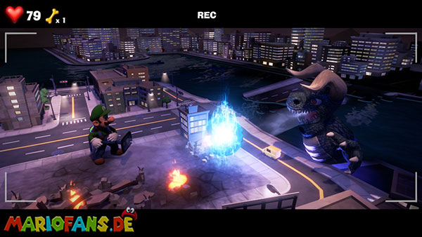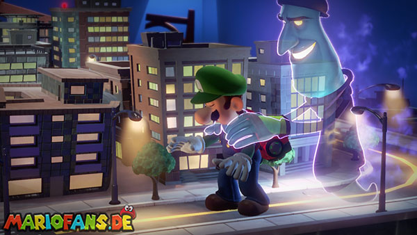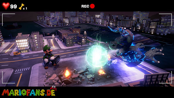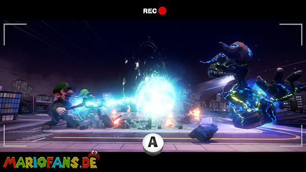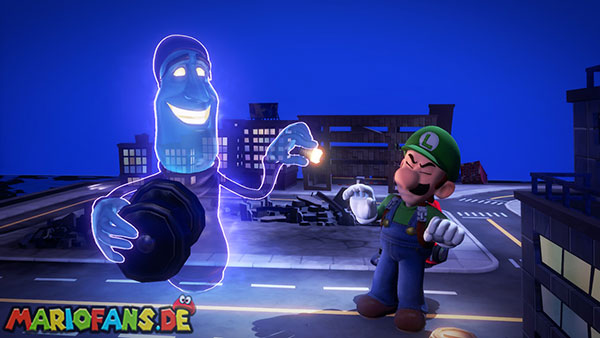Folgt dann dem Geist ins Stadt-Set in Saal 5. Hier bekommt ihr es in einer Stadt-Kulisse mit einem Monster zu tun. Spuckt es Energiebälle aus, blast diese direkt zu ihm zurück. Bei dem zweiten, größeren Ball benötigt ihr Fluigis Hilfe, um ihn zurückzublasen. Und beim Dritten macht ihr es genauso, müsst nur zwischendurch schnell A drücken. Fangt dann noch den Geist und ihr erhaltet vom Regisseur den Aufzugknopf für die neunte Etage.