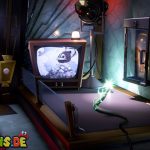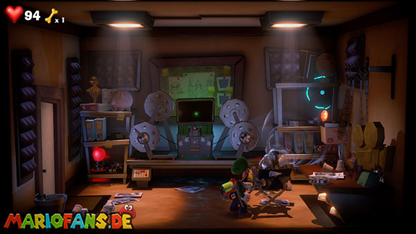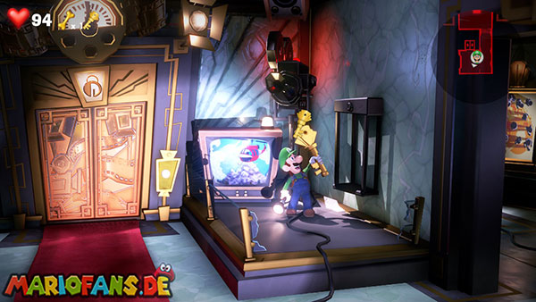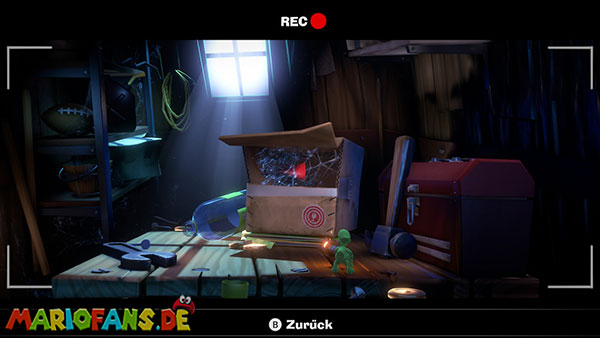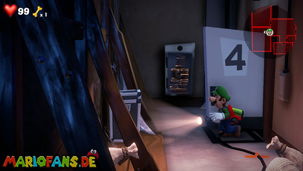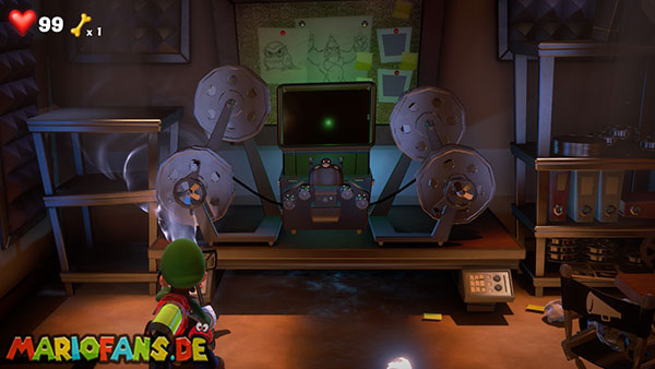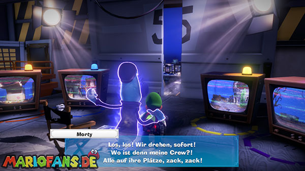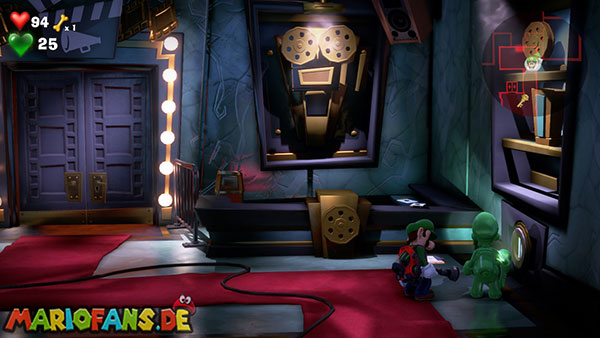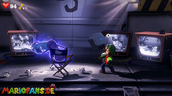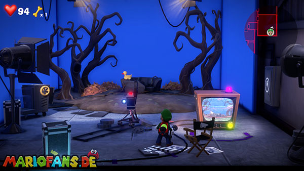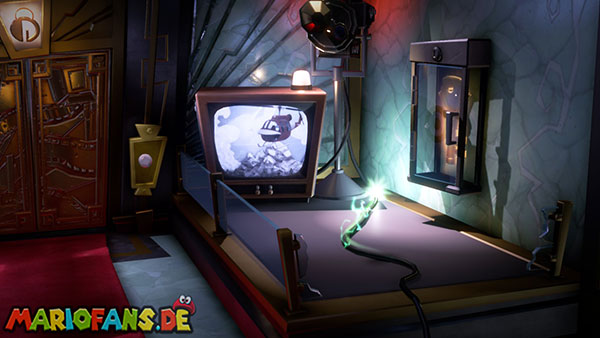 Das Megafon befindet sich in Saal 4 im Pappkarton, allerdings hängt es in Spinnweben fest, sodass ihr irgendwie Feuer beschaffen müsst. Im Mittelpunkt des Rätsels stehen die Fernseher, die sowohl im Backstage-Bereich als auch in jedem Studio stehen. Da Luigi keine Tür öffnen kann, wenn er ein Objekt hält, müsst ihr Gegenstände über die Fernseher transportieren.