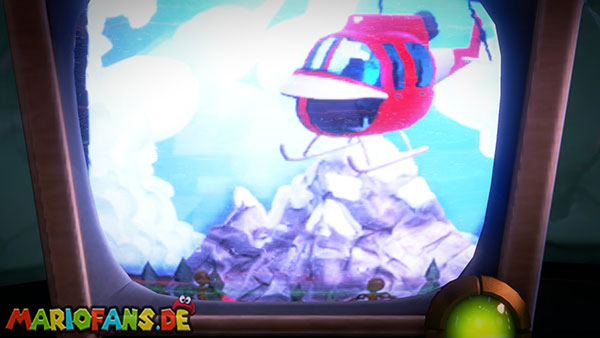 Klettert auf die Hebebühne und lasst euch von Fluigi nach oben fahren. Balanciert zu dem eingefrorenen Juwel und geht mit ihm durch den Fernseher zum Feuer-Set. Übergebt den Eisblock an Fluigi und stellt Luigi hinter die Kamera. Mit Fluigi geht ihr nun zu den Flammen, die aus der Tür schießen, und schmelzt dort das Eis.