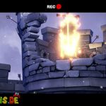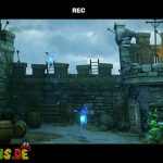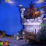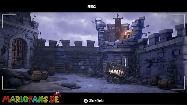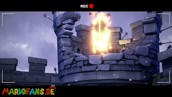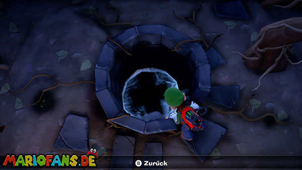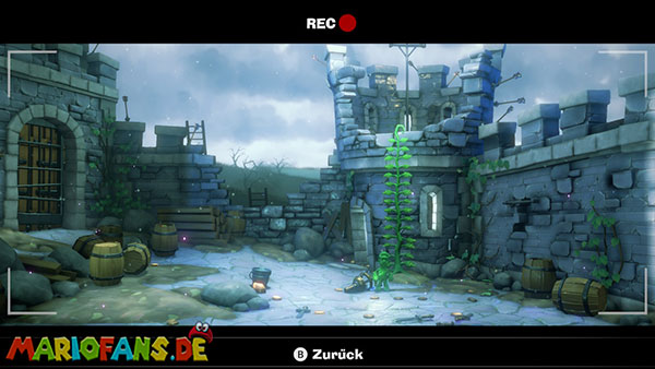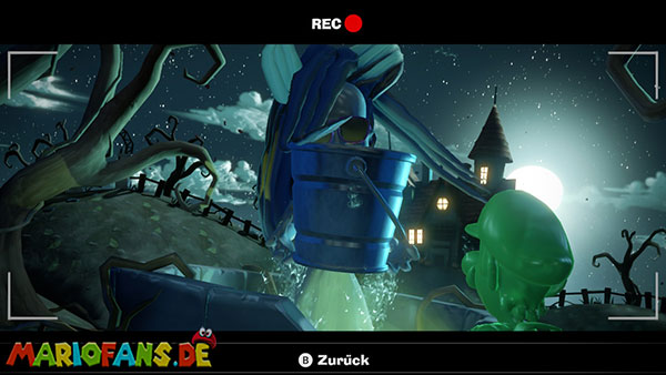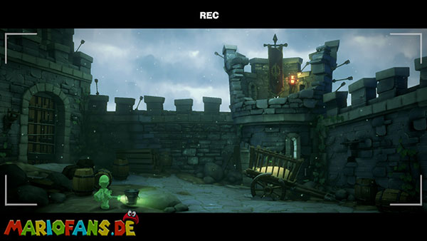 Stellt den Eimer ab und aktiviert mit Luigi die Kamera. In der folgenden Szene stürmen Geister die Burg, die ihr mit Fluigi erledigen müsst. Danach müsst ihr das Wasser aus dem Eimer auf die Pflanze vor dem Turm gießen. Diese wächst bis zur Spitze und ihr könnt nach oben klettern, wo ihr euch die Fackel schnappen könnt.