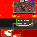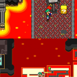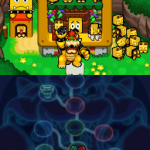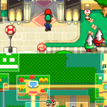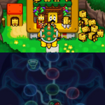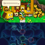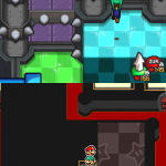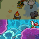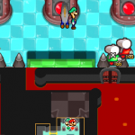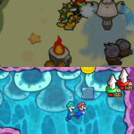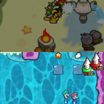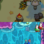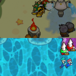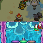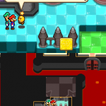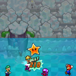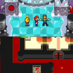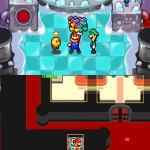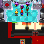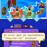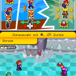 Benutze zuerst den Sternenmix auf den oberen Shroob, danach die Kreiselröhre auf den gleichen. Als nächstes wieder den Sternenmix, diesmal auf den unteren und erneut die Kreiselröhre. Den letzten Shroob solltest du mit dem Trampolin besiegen können. Der Lohn ist eine neue Spezialattacke „Teleporter-Tür“.