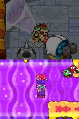 Dies ist wirklich der letzte Bereich ;). Gehe nach links und schalte das Licht auf Bowsers Bauch aus, du siehst die lilanen Buu Huu Blöcke, springe unten rechts auf einen, um nach oben zu gelangen. Schalte nun das Licht wieder an und merke dir die Ordnung der Zahlen, am besten aufschreiben. Wieder Licht aus und die Buu Huus von 1-6 anspringen, sie verbinden sich nun zu einen großen Block. Klettere hoch und wirbel dich nach rechts rüber. Du siehst wieder so eine komische Tür, wo das Dreieck von vorhin passt, setze es ein und du kannst im geheimen Raum Bohnen erhalten, indem du dich aus den Boden schießt, wo es blinkt. Wenn du alles eingesammelt hast, gehe nach rechts weiter und aktiviere das letzte Teil. Sammle nun das komplette Sternenteil ein (Licht auf Bowsers Magen) und gehe damit nach ganz oben, wo die Raupe vorhin verschwunden ist.