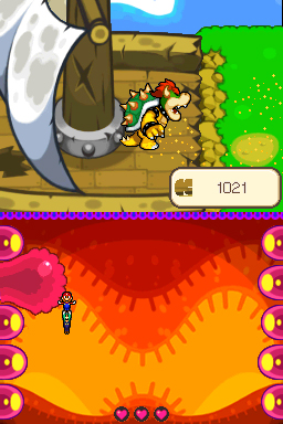 Jetzt musst du mit Mario & Luigi ein Minispiel in Bowsers Nase machen und ihn zum niesen bringen. Dadurch schwimmt das Schiff weg und ihr kommt mit dem Floß zu neuen Gegenden. Auch dies ist wieder ein Labyrinth, du bist richtig, wenn du auf der Insel speichern kannst. Auf dieser Insel ist auch wieder das Schiff und ein paar Blumen. Wieder das gleiche Spiel, du musst Bowser zum niesen bringen. Jetzt zerstörst du die Wand zu den Koopas und kannst diese befreien. Bowser lernt „Koopa-Keile“. Nimm unten das Floß und schlage dich zur nächsten Insel, einmal Floßwechsel und es kann weiter gehen. Auf dem Wasser sind Pfeile, die dir helfen den richtigen Weg zu finden. Wenn du an einer Insel ankommst, wo du speichern kannst, bist du richtig. Speichere dort auch.