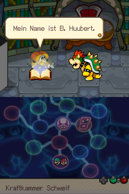 Im Turm, solltest du erstmal speichern. Benutze danach den Fahrstuhl nach oben und gehe in den Raum. Suche das Buch, welches auf dem Schreibtisch liegt. Kurz darauf erscheint B. Huubert. Dieser erzählt vom Buu Huu Strahler. Bowser wird sich vor ihn stellen und Mario & Luigi können erneut die Energiekammer aufsuchen. Dort ist jetzt der Weg frei, und die Reise kann weiter gehen.