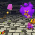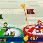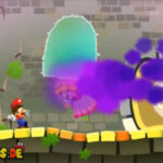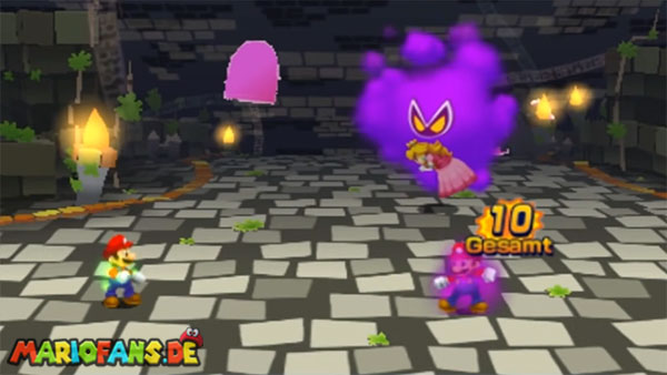 - Sobald die Traum-Marios verschwinden und euch dafür die große, violette Wolke gegenübersteht, startet ein kleines Minispiel. In diesem müsst ihr Münzen einsammeln sowie Feuerbällen ausweichen. Seid dabei nicht zu gierig und konzentriert euch auf Letzteres: Ein Treffer verursacht im Vergleich zu einem erfolgreichen Traum-Mario-Angriff doppelt so viel Schaden! Überdies verliert ihr mehrere Münzen, weshalb am Ende gar ein Minus herauskommen könnte. Konzentriert euch zudem auf den Pilzkopf, der euch zwischenzeitlich entgegenkommt. Dieser heilt 30 Schadenspunkte, was gerade in Anbetracht der schwer auszuweichenden Traum-Mario-Attacken mehr als fair ist.