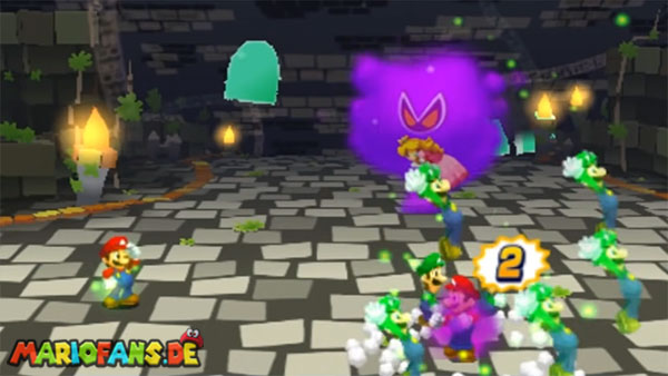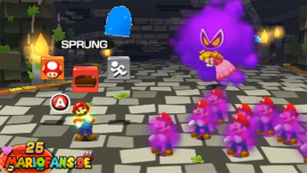 Sobald der Kampf beginnt und sich die Traum-Marios vor euch formieren, achtet ihr auf den einen, der zu Beginn in der Mitte steht. Beobachtet ganz genau, wo er hinläuft, und greift ihn anschließend mit einer Sprungattacke an. Achtung: Sollten dabei einer oder mehrere Traum-Marios durch die Luft wirbeln, dann werden euch diese kurz darauf angreifen. Genau genommen fliegen sie in hohem Tempo von schräg oben in eure Richtung, weshalb ihr ihnen durch fleißiges Springen ausweichen müsst.